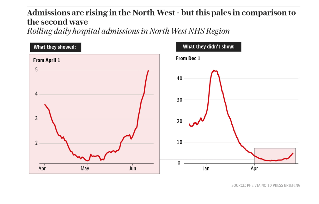 Downing Street’s choice of graphs need to be seen in the context that its own modellers have already admitted that they do not know whether releasing restrictions on June 21 would have caused unsustainable pressure on the NHS.